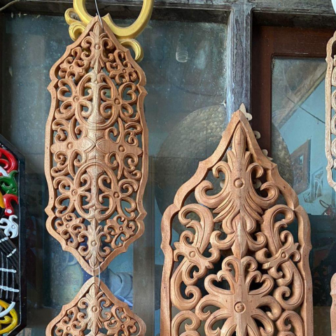 Kalung manik, gelang kayu, hiasan ukiran Dayak